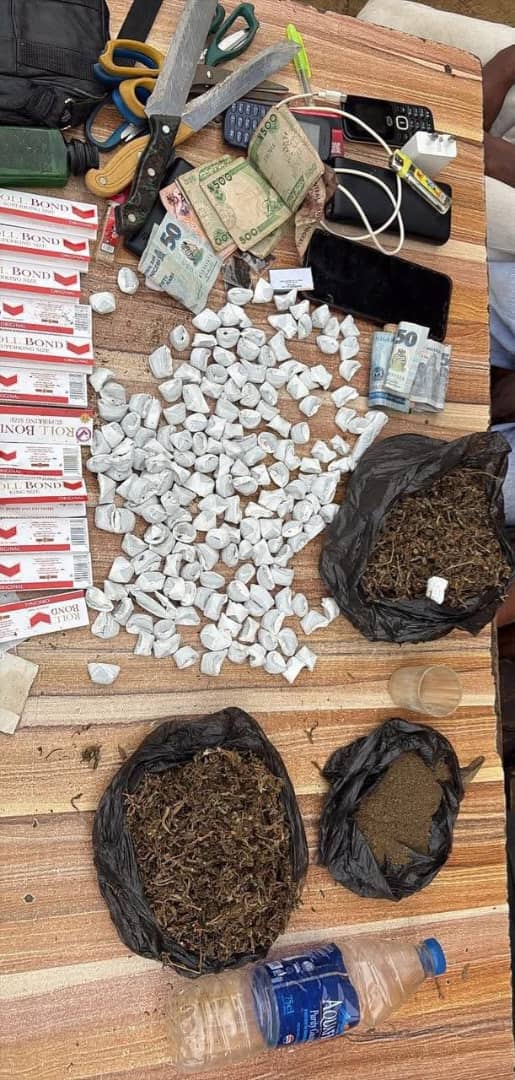 Items recovered during the raid include substances suspected to be Indian hemp, ₦28,000 cash, mobile phones, a lighter, two kitchen knives, two pairs of scissors, and a black bag.