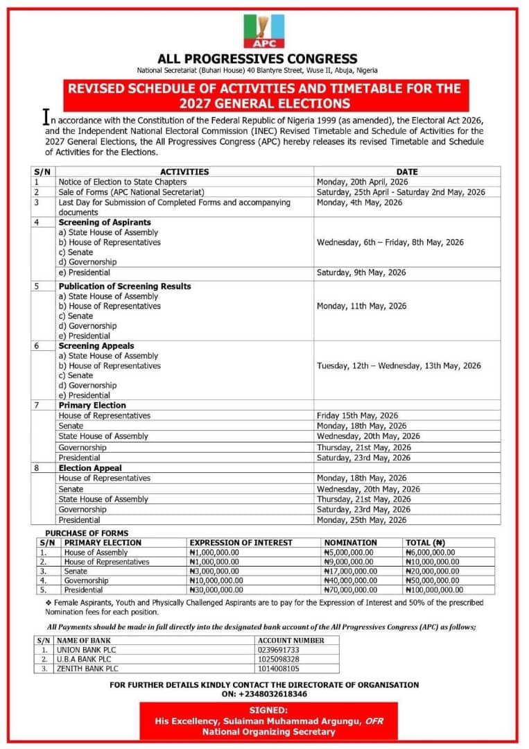 The All Progressives Congress (APC) has announced a revised timetable and schedule of activities ahead of the 2027 General Elections, adjusting key dates and procedures in its electoral roadmap.