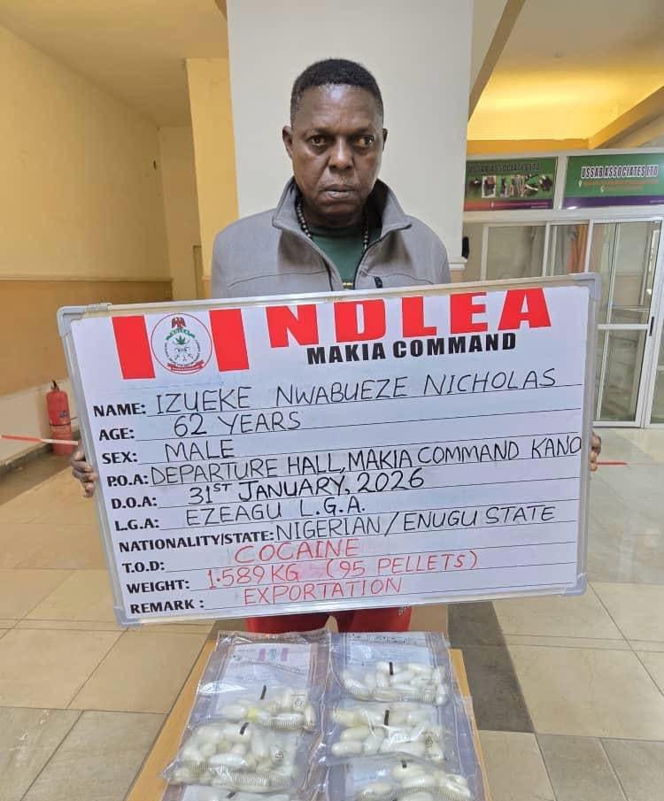 Operatives of the National Drug Law Enforcement Agency (NDLEA) have arrested a 62-year-old Lagos-based businessman, Nwabueze Izueke, at the Mallam Aminu Kano International Airport, Kano State, for attempting to traffic cocaine to China.