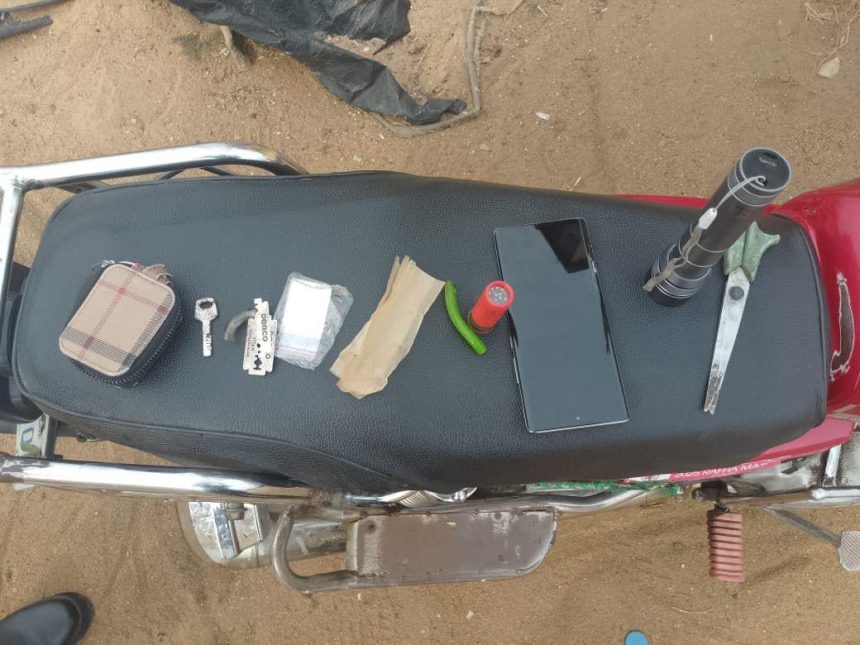 Items recovered at the scene include one live cartridge, an Infinix Hot 50 Pro mobile phone, a red tank Kymstom motorcycle with registration number UNC-370-QG (Abia State), scissors, a torchlight, razors, and nylon materials suspected to be used for packaging crystal methamphetamine.