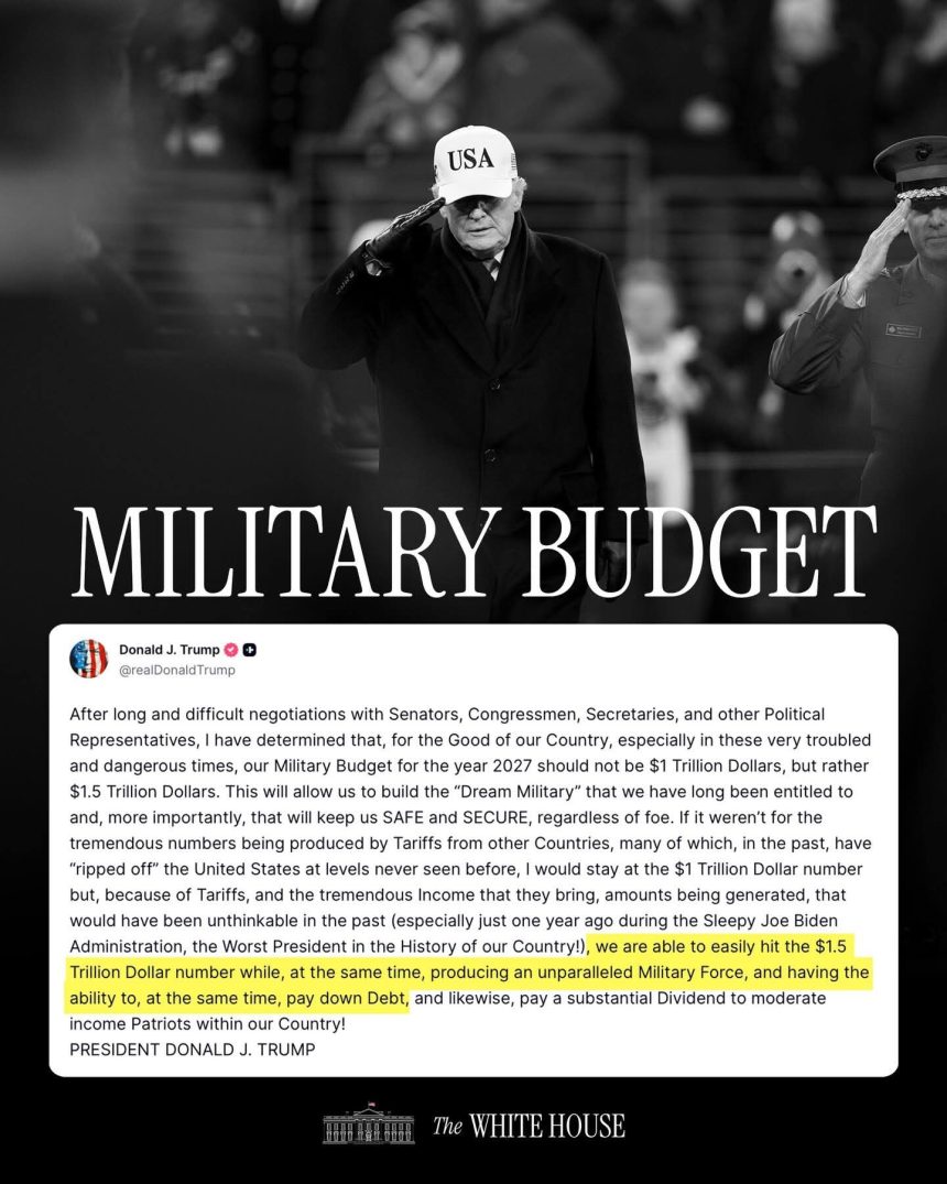 United States President, Donald Trump has announced plans to increase the country’s military budget for the 2027 fiscal year to 1.5 trillion dollars, citing national security concerns, rising revenue from tariffs.